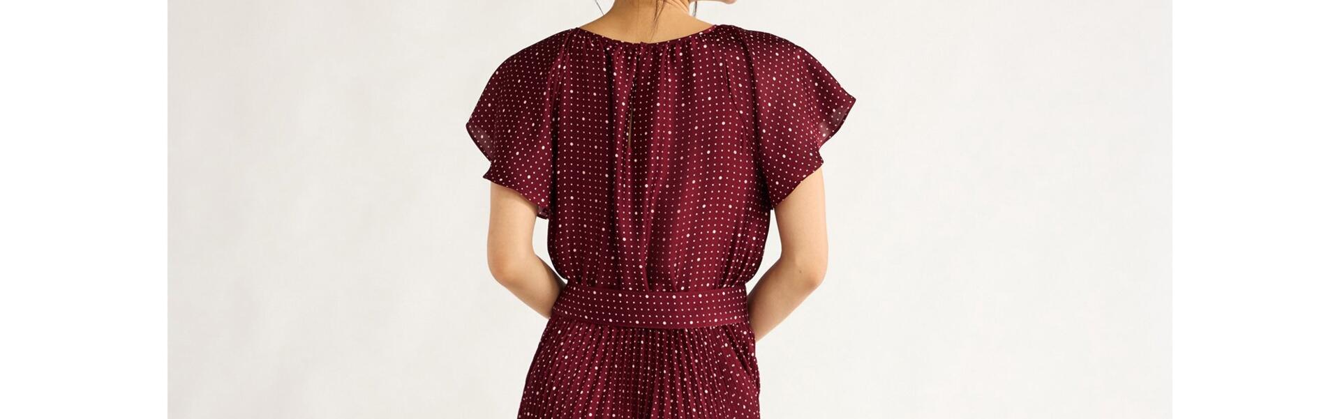 - Features: Round neckline with back button and keyhole; self-tie belt; belt loops; fully pleated skirt