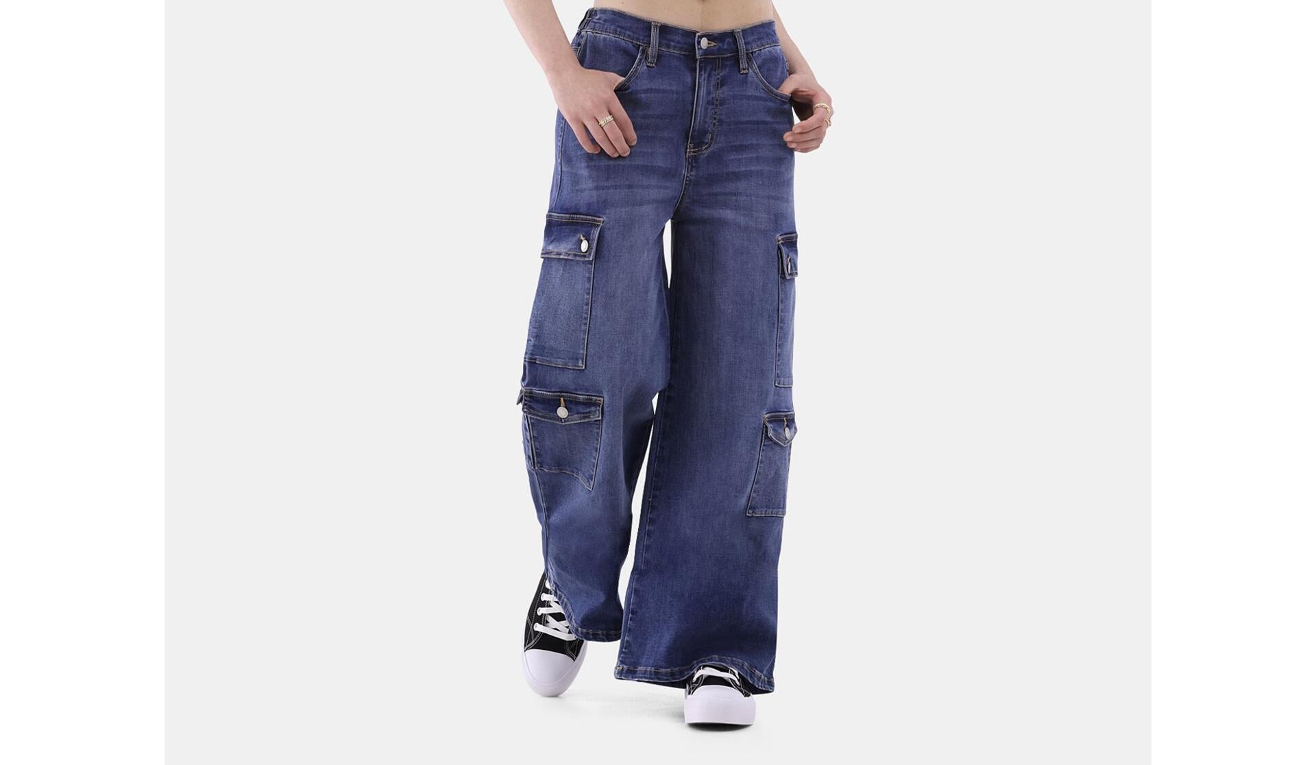 No Boundaries Women Baggy Cargo Jeans 32 Inseam Dark Wash Size S (4-6)