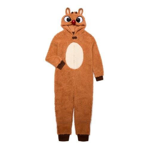- CUTE RUDOLPH UNION SUIT - This adult Rudolph union suit has a hood, front zip zipper, Rudolph's embroidered eyes, His shiny red nose, and cute 3-D ears on the hood, ribbed cuffed fabric at the wrist and ankles so you can wear them with your favorite pair of shoes, socks, or slippers