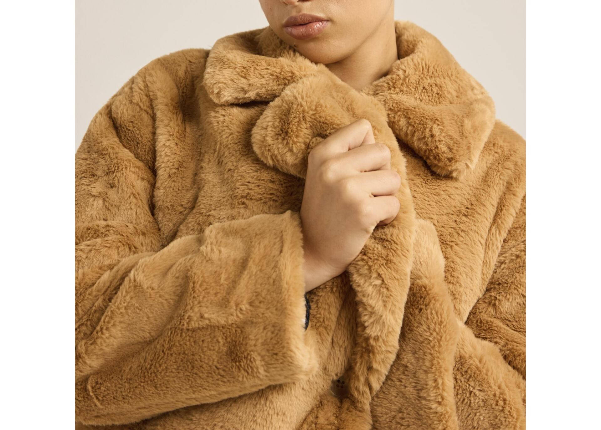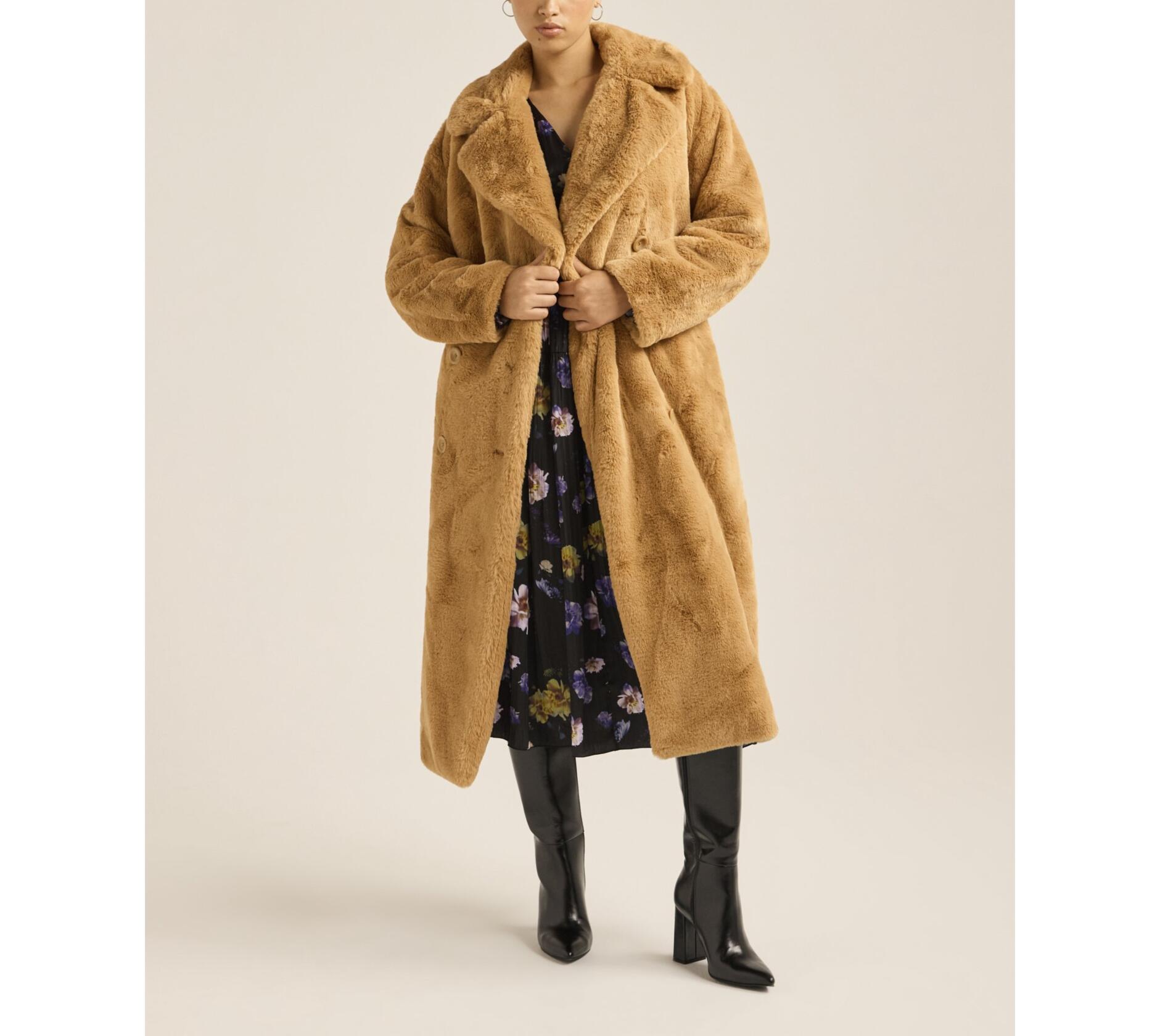 - Features: Super-soft, plush faux fur; double-breasted design; fully lined