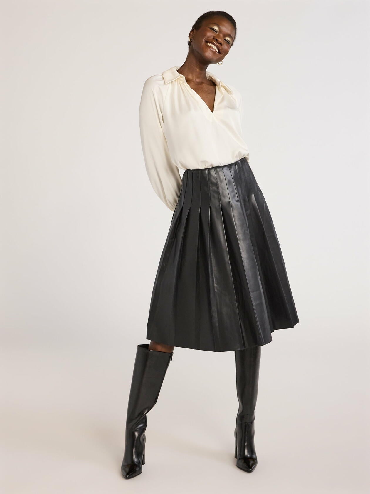- Features: Smooth matte satin fabric; soft shirring at neckline and cuffs