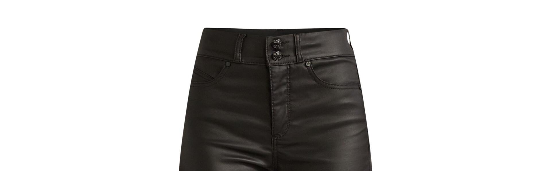 - Features: Belt loops; faux leather evil eye patch at back waist; black color features a coated finish