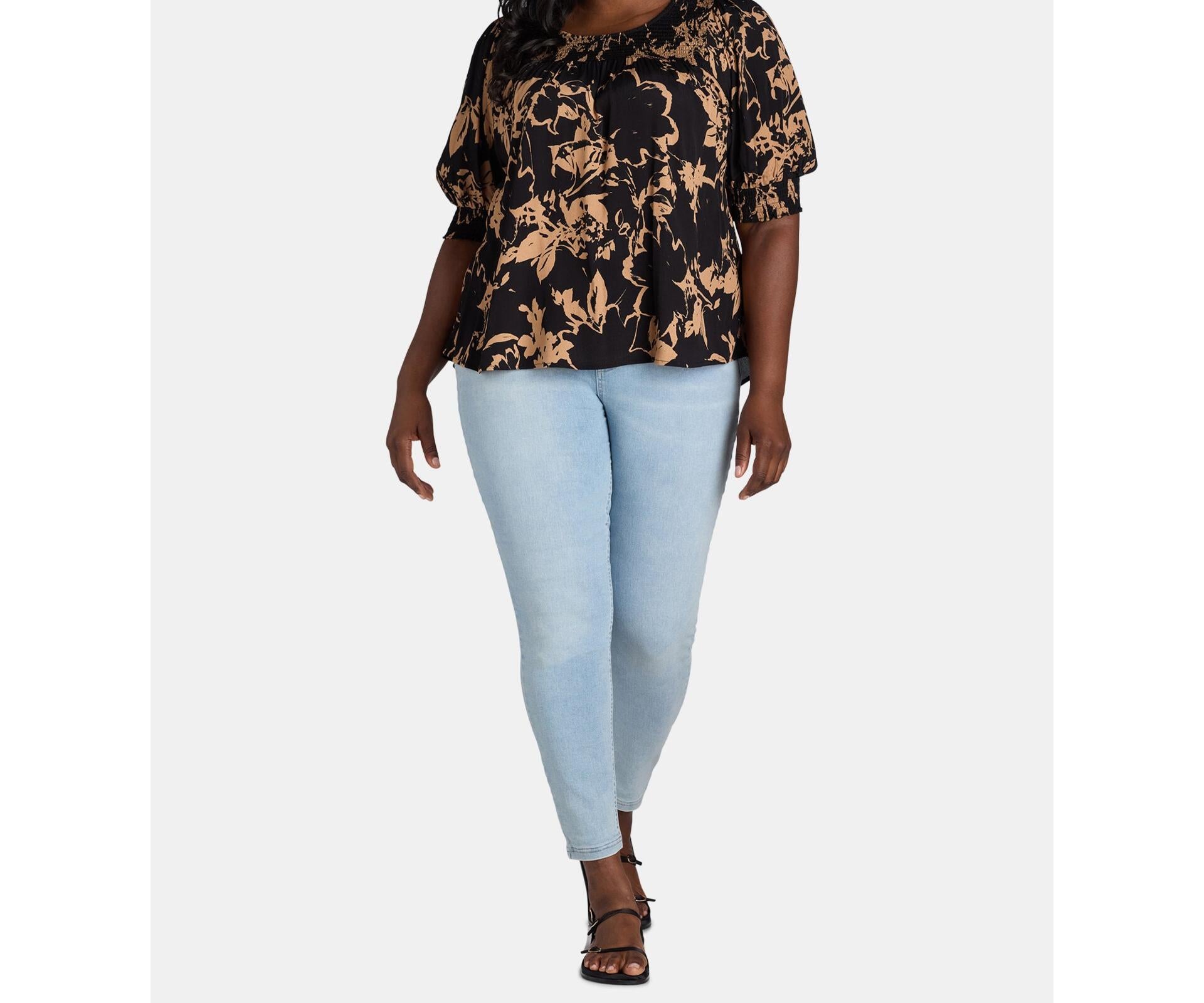 Terra & Sky Womens Plus Smocked Blouse Black Floral Size 1X
