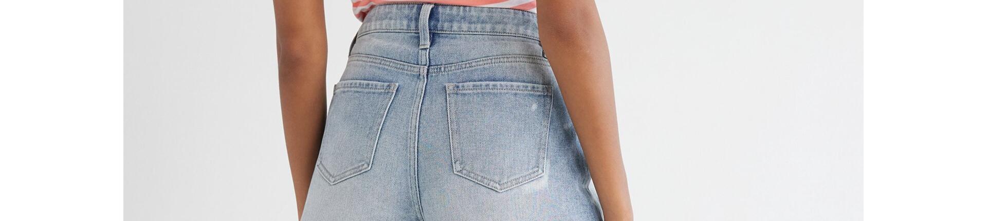 - Features: Classic non-stretch denim; cutoff hem; destructed details