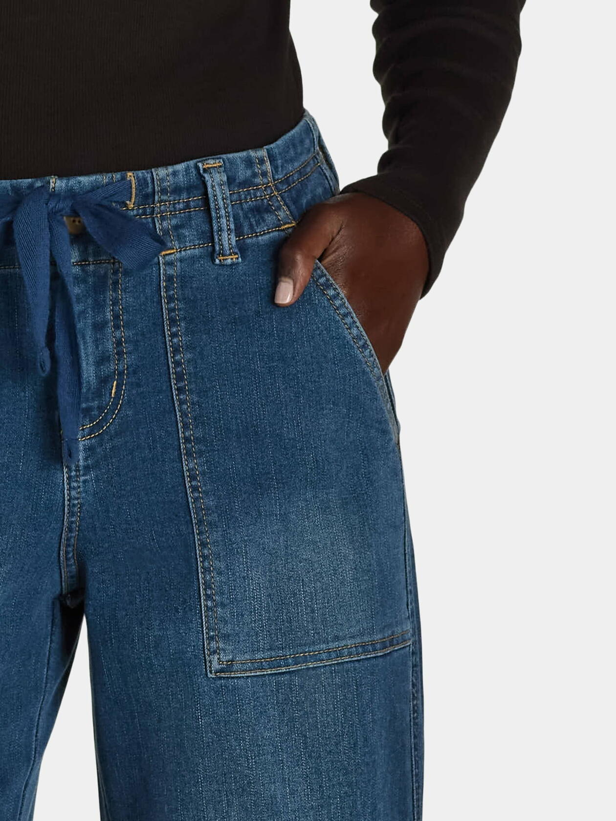 - Closure: Button closure with zip fly; adjustable drawstring tie