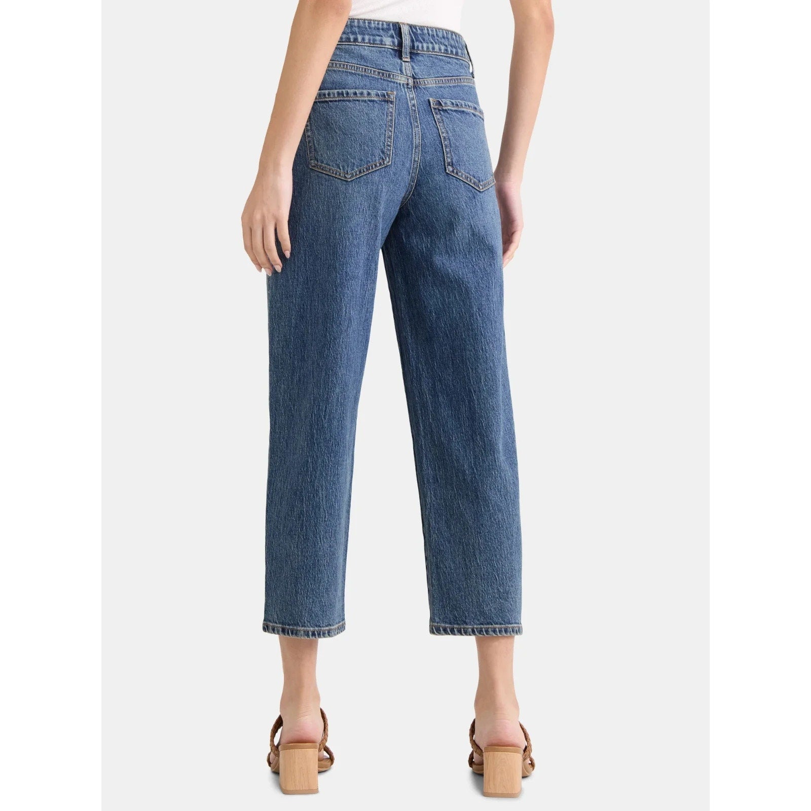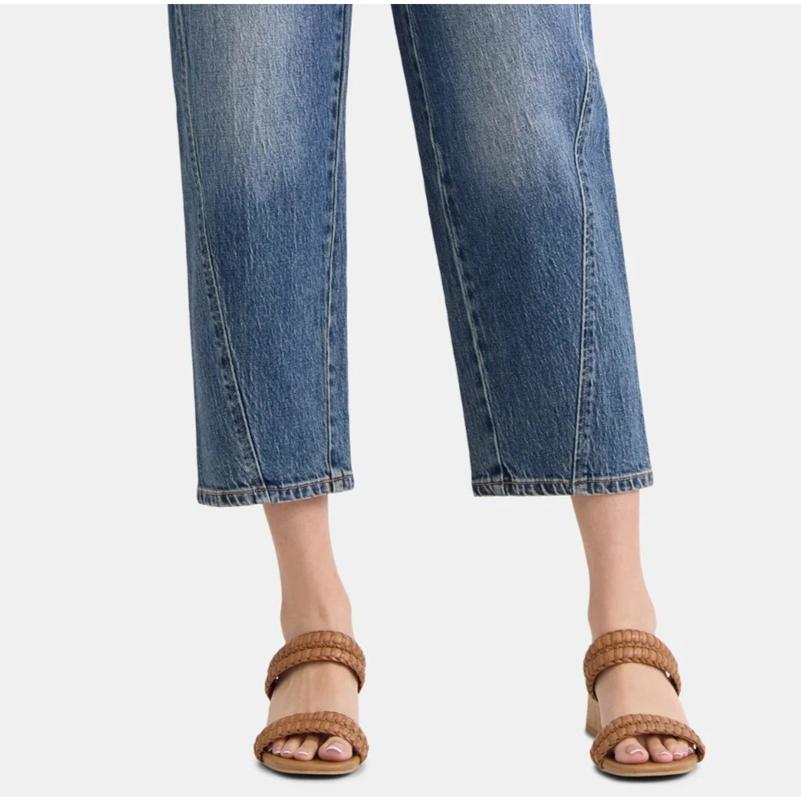* Features: Belt loops; stretch denim; cropped length